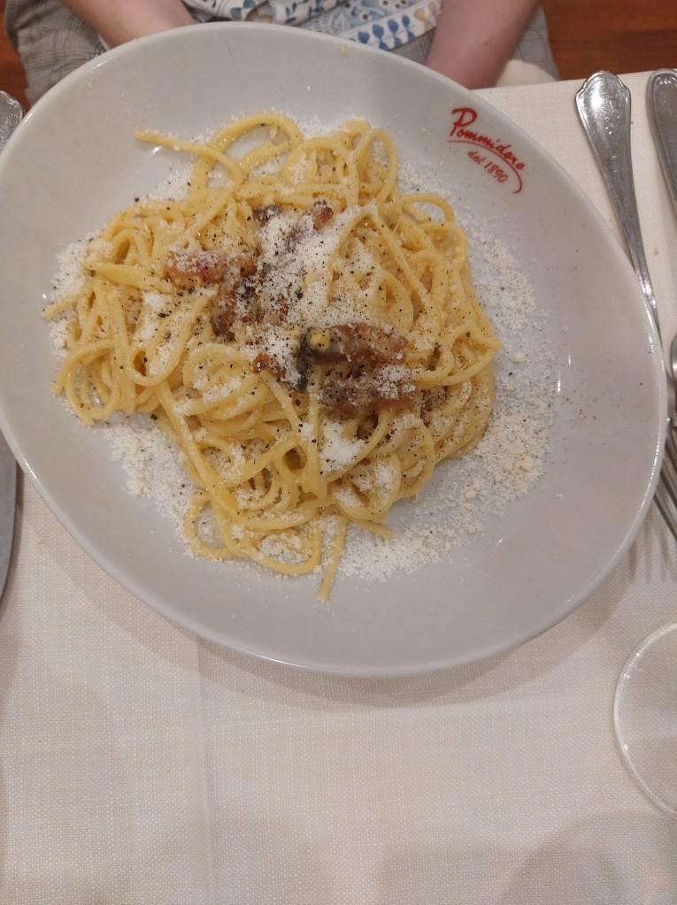 According to Stanley Tucci’s Searching for Italy series, the best carbonara in Rome is to be found at Pommidoro, so obviously we had to go there. Harry had the classic, while I had the ‘sbagliata’ or ‘wrong carbonara’ (carbonara with the addition of tomatoes). It did not disappoint and we are still raving about the restaurant’s incredible olive oil.